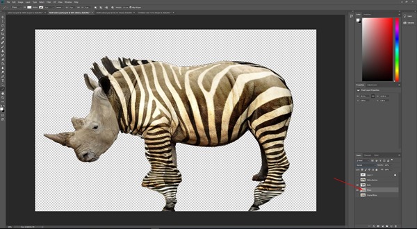 Since I liked the high contrast color of the zebra, I decided to use the actual fur and "mold" it over the rhino's body. So with that said, I extracted the zebra from its background and pasted it into the rhino file on a new layer.